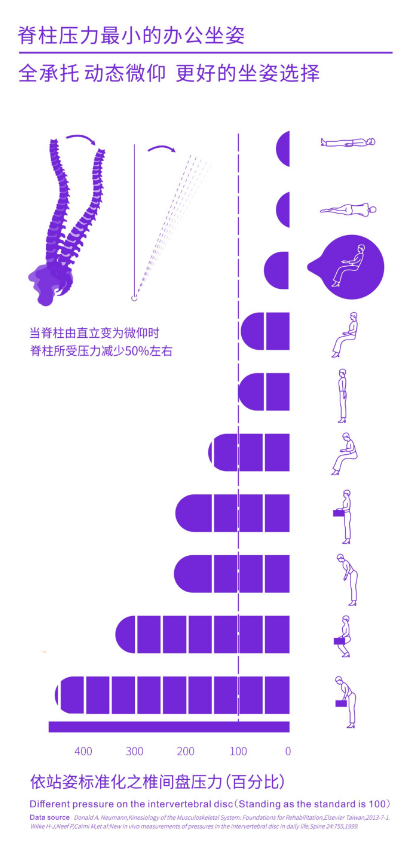 例如,在傳統人體工學(xué)椅中,我們會(huì )指出正確的坐姿是3個(gè)90°的“正坐坐姿”。但現實(shí)情況是,“正坐坐姿”要求人們有一個(gè)相對健壯的核心肌群,尤其是腹??;而長(cháng)期久坐的人,基本上都沒(méi)有強健腹肌,也就意味著(zhù)無(wú)法主動(dòng)維持“正坐坐姿”,最后“正坐”都會(huì )演變?yōu)樗?/span>