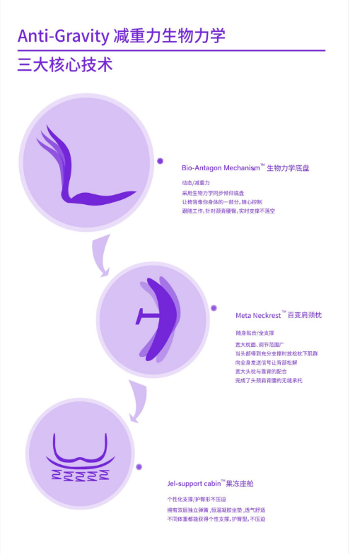 基于這一理念,坐感科技開(kāi)發(fā)了減重力生物力學(xué)椅的全新技術(shù),通過(guò)模仿生物拮抗力學(xué),設計研發(fā)了生物力學(xué)底盤(pán);百變肩頸枕,給予肩頸有效的支撐,與生物力學(xué)底盤(pán)聯(lián)動(dòng),在傾仰過(guò)程中符合人體生物力學(xué)的需求,一鍵松解背部肌肉,有效減緩疲勞速度。
