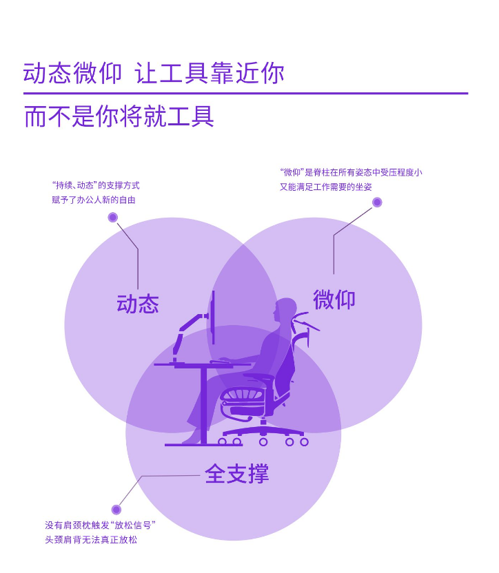 動(dòng)態(tài)、微仰、全支撐的動(dòng)態(tài)微仰坐姿,為醉心工作人群解鎖一種新型的辦公坐姿,輕松健康又自由高效。
